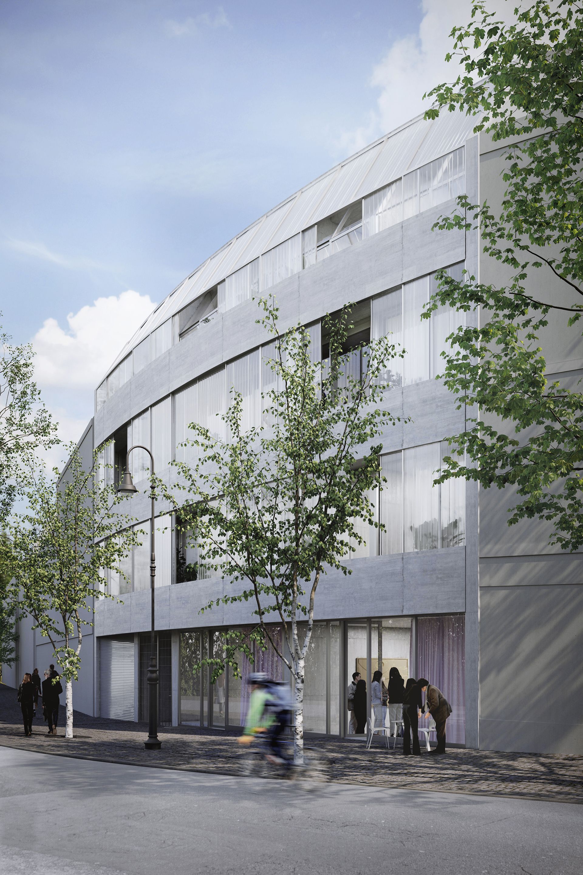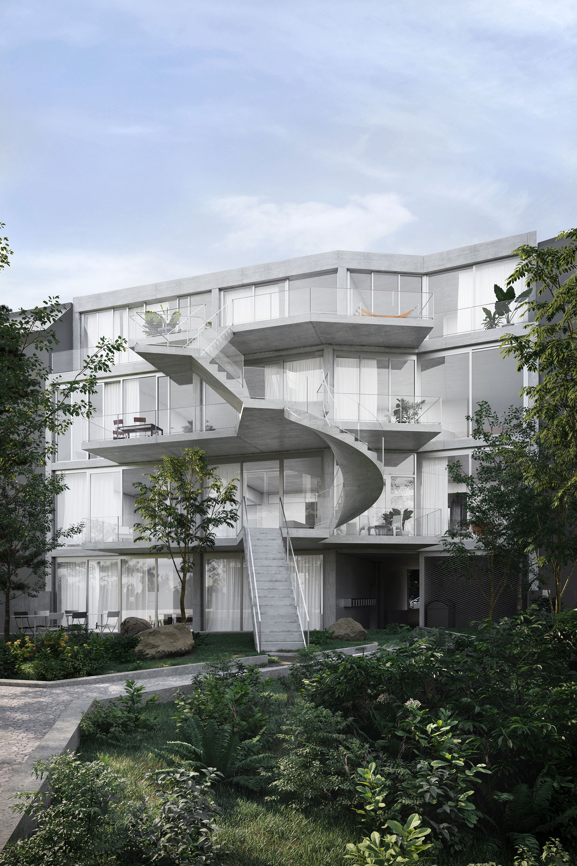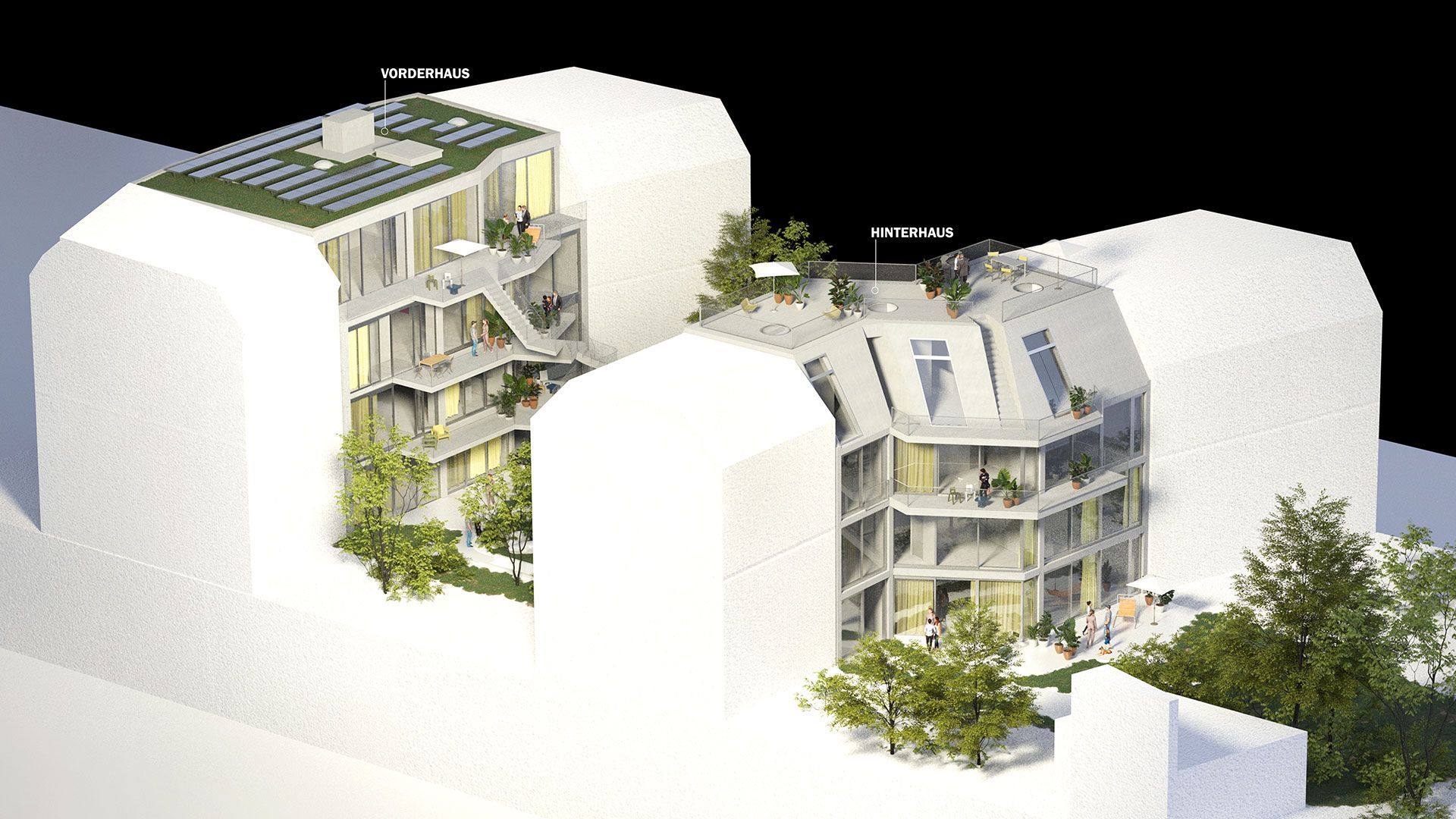 Jede Wohnung im Vorderhaus hat Zugang zu zwei Fassaden und ermöglicht somit eine Licht- und Luftdurchflutung der Innenräume. Die Grundrisse gestalten sich nach einem Schichtungs-Prinzip, durch das auf Flure komplett verzichtet werden kann. Grosse offene Wohnbereiche werden von einer skulpturalen Aussentreppe und grosszügigen Balkonen erschlossen. Eine Schicht aus begehbaren Wintergärten trennt die Schlafräume von der Strasse. Die Fassade kann flexibel vom Bewohner geöffnet und geschlossen werden. Jede Wohnung wird direkt aus dem Lift betreten. Nichttragende Wände werden teilweise als Schränke ausgebildet und schaffen so platzsparend Stauraum.