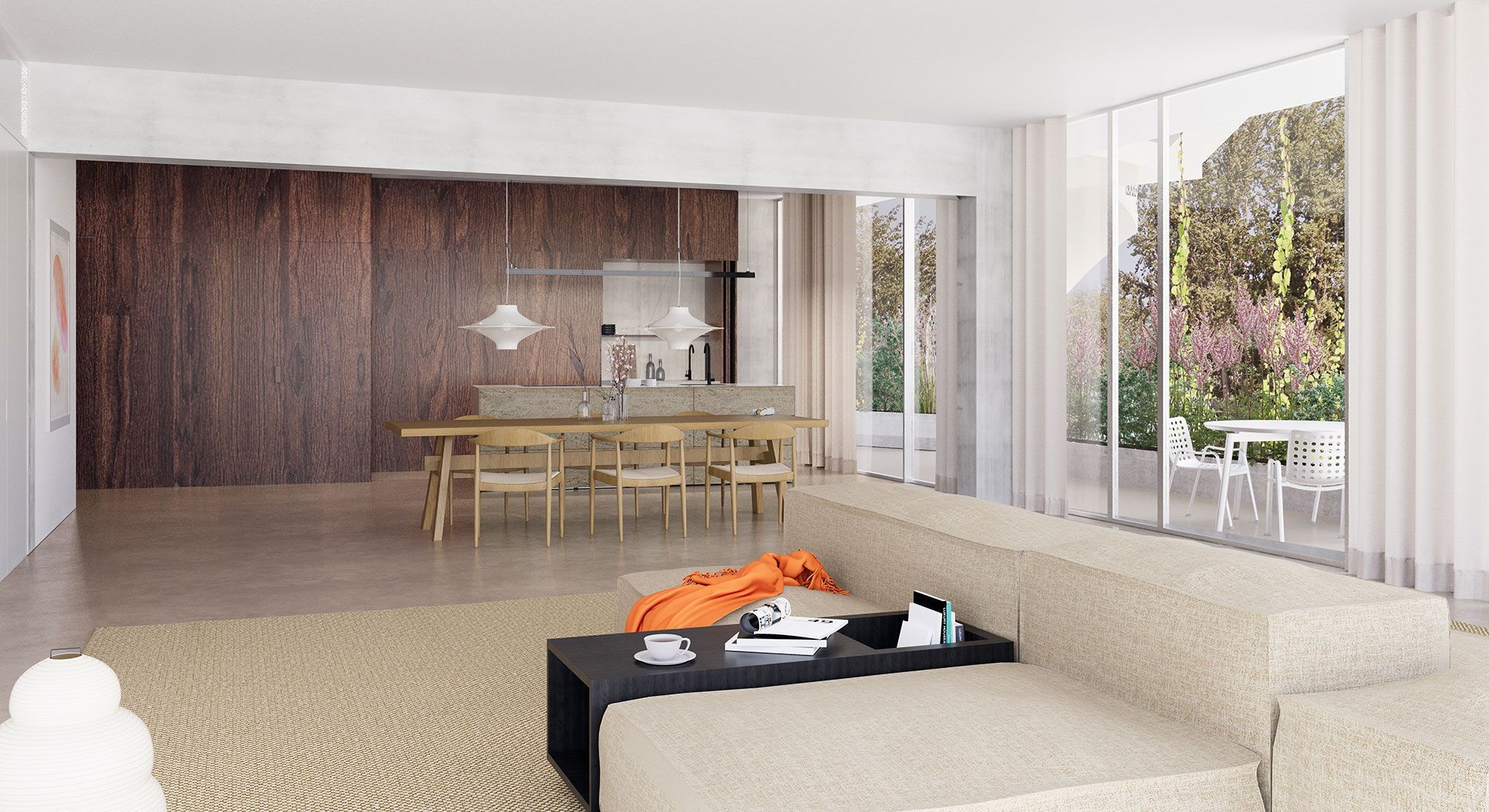 An erster Stelle des Entwurfs standen die Qualität der Räume und deren flexible Nutzung. Struktur und Raum ermöglichen den Bewohnern ihre Lebensweise über die Jahre zu ändern. Die Wohnräume in den verschiedenen Gebäuden und Gebäudeteilen sind sehr unterschiedlich in Größe, Anordnung und Platzierung, sind jedoch immer so konzipiert, dass sie ein Maximum an Tageslicht erhalten und wechselnde Ausblicke auf den begrünten Innenhof oder auf die Strasse bieten.